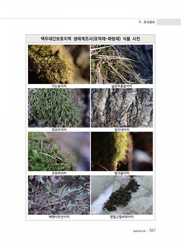 Ⅱ. 조사결과 www.nie.re.kr ? 341 백두대간보호지역 생태계조사 묘적재화방재 식물 사진 가는윤이끼 넓은주름솔이끼 쥐꼬리이끼 참지네이끼 큰부리이끼 털거울이끼 패랭이우산이끼흰털고깔바위이끼