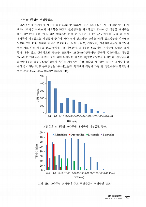 나 소나무림의 직경급분포 소나무림의 개체목의 직경이 모두 미만으로서 이중 정도는 직경이 미만의 개 체로서 직경급 의 개체목은 로 절반정도를 차지하였고 이상 직경급 개체목은 매우 적었는데 불과 도 되지 않았으며 가장 큰 임목은 직경이 이었다 군락 내 전체 개체목의 직경분포는 직경급의 증가에 따라 점차 감소하는 완만한 역 형 분포양상을 나타내고 있었다 그림 임내에 개체수 분포비율이 높은 소나무 신갈나무 만주잎갈나무와 물박달나 무는 서로 다른 직경급 분포 양상을 나타내었는데 소나무는 이하 직경급에 속하는 개체 목이 매우 많고 상대적으로 골고루 분포하며 이상부터는 급속히 감소하였고 직경급 이상 개체목은 수량이 모두 적게 나타나는 완만한 역 형분포양상을 나타냈다 신갈나무와 물박달나무는 모두 직경급에 속하는 개체목이 ...