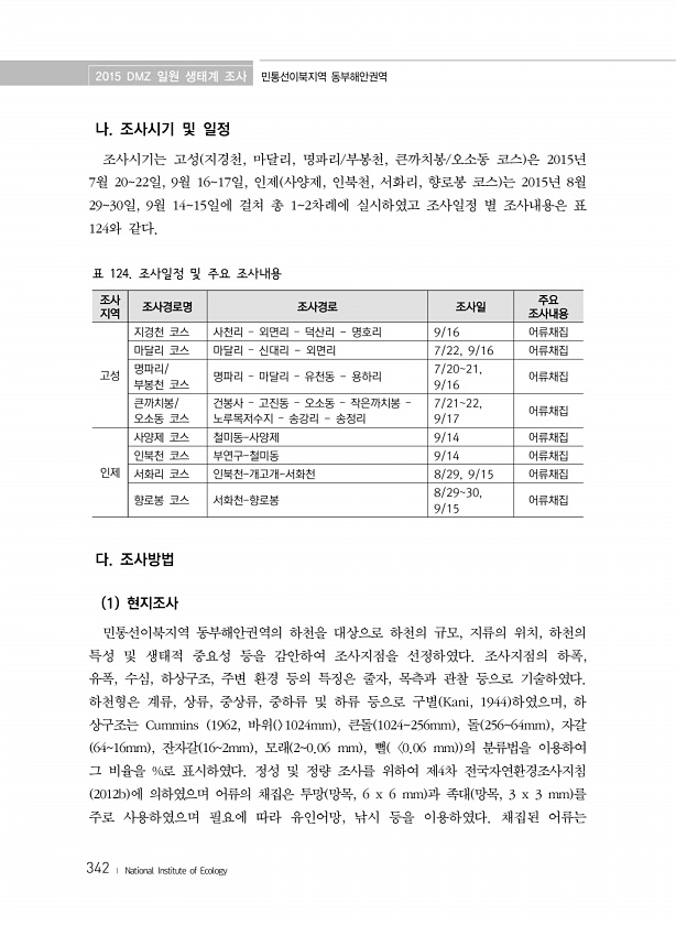 2015 DMZ 일원 생태계 조사 민통선이북지역 동부해안권역 342 ? National Institute of Ecology 나. 조사시기 및 일정 조사시기는 고성 지경천, 마달리, 명파리/부봉천, 큰까치봉/오소동 코스 은 2015년 7월 2022일, 9월 1617일, 인제 사양제, 인북천, 서화리, 향로봉 코스 는 2015년 8월 2930일, 9월 1415일에 걸쳐 총 12차례에 실시하였고 조사일정 별 조사내용은 표 124와 같다. 조사 지역 조사경로명 조사경로 조사일 조사내용 주요 고성 지경천 코스 사천리 ? 외면리 ? 덕산리 명호리 9/16 어류채집 마달리 코스 마달리 ? 신대리 외면리 7/22, 9/16 어류채집 명파리/ 부봉천 코스 명파리 ? 마달리 ? 유천동 용하리 7/2021, 9/16 어류채집...