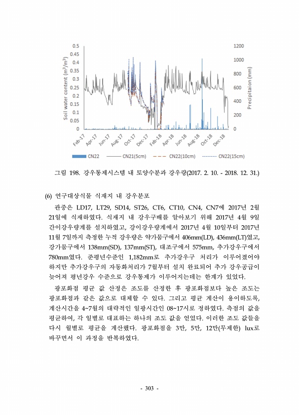 303 그림 198. 강우통제시스템 내 토양수분과 강우량 2017. 2. 10. 2018. 12. 31. 6 연구대상식물 식재지 내 강우분포 관중은 LD17, LT29, SD14, ST26, CT6, CT10, CN4, CN7에 2017년 2월 21일에 식재하였다. 식재지 내 강우구배를 알아보기 위해 2017년 4월 9일 간이강우량계를 설치하였고, 강이강우량계에서 2017년 4월 10일부터 2017년 11월 7일까지 측정한 누적 강우량은 약가뭄구에서 406mm LD , 436mm LT 였고, 강가뭄구에서 138mm SD , 137mm ST , 대조구에서 575mm, 추가강우구에서 780mm였다. 준평년수준인 1,182mm로 추가강우구 처리가 이루어졌어야 하지만 추가강우구의 자동화처리가 7월부터 설치 완료되어...