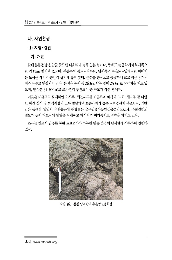 2018 특정도서 정밀조사 신안 1 북부권역 338 ? National Institute of Ecology 1 · 갈매섬은 전남 신안군 증도면 대초리에 속해 있는 섬이다. 압해도 송공항에서 북서쪽으 로 약 9km 떨어져 있으며, 북동쪽의 증도∼매화도, 남서쪽의 자은도∼암태도로 이어지 는 도서군 사이의 중간적 위치에 놓여 있다. 본섬을 중심으로 동남부에 크고 작은 3 개의 여와 사주로 연결되어 있다. 본섬은 동서 폭 260m, 남북 길이 250m 로 삼각형을 띠고 있 으며, 면적은 31,200 ㎡로 조사권역 무인도서 중 규모가 작은 편이다. 이곳은 대규모의 모래해안과 사주, 해안사구를 비롯하여 파식대, 노치, 해식동 등 다양 한 해안 침식 및 퇴적지형이 고루 발달하여 보존가치가 높은 지형경관이 분포한다. 기...