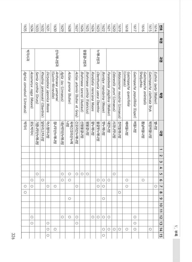 Ⅴ. 부록 326 번호 목명 과명 학명 국명 1 2 3 4 5 6 7 8 9 10 11 12 13 14 15 1614 Euthrix laeta Walker 별나방 ○ 1615 Gastropacha clathrata Bryk 북방버들나방 ○ 1616 Gastropacha orientalis Sheljuzhko 톱날버들나방 ○ 1617 Gastropacha populifolia Esper 버들나방 ○ ○ ○ 1618 Gastropacha quercifolia Linnaeus 배버들나방 ○ ○ ○ 1619 Malacosoma neustria Linnaeus 천막벌레나방 ○ ○ 1620 Odonestis pruni Linnaeus 사과나무나방 ○ ○ 1621 Paralebeda plagifera Walker 대만나...