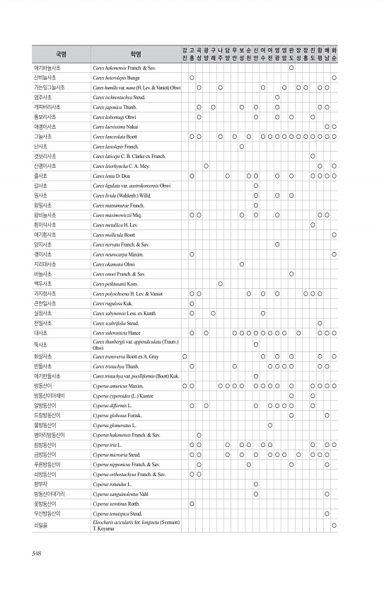 348 애기바늘사초 Carex hakonensis Franch. & Sav. ○ 산비늘사초 Carex heterolepis Bunge ○ ○ 가는잎그늘사초 Carex humilis var. nana H. Lev. & Vaniot Ohwi ○ ○ ○ ○ ○ ○ ○ ○ 염주사초 Carex ischnostachya Steud. ○ 개찌버리사초 Carex japonica Thunb. ○ ○ ○ ○ ○ ○ ○ 통보리사초 Carex kobomugi Ohwi ○ ○ ○ ○ ○ 애괭이사초 Carex laevissima Nakai ○ ○ 그늘사초 Carex lanceolata Boott ○ ○ ○ ○ ○ ○ ○ ○ ○ ○ ○ ○ ○ ○ ○ ○ 난사초 Carex lasiolepis Franch. ○ 갯보리사초 Carex la...