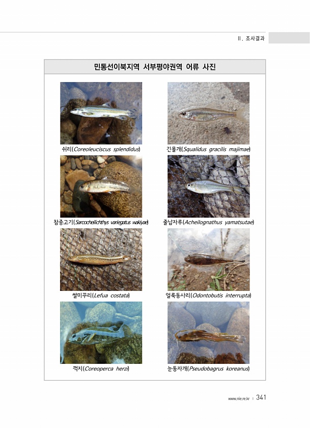 Ⅱ. 조사결과 www.nie.re.kr ? 341 민통선이북지역 서부평야권역 어류 사진 쉬리 Coreoleuciscus splendidus 긴몰개 Squalidus gracilis majimae 참중고기 Sarcocheilichthys variegatus wakiyae 줄납자루 Acheilognathus yamatsutae 쌀미꾸리 Lefua costata 얼룩동사리 Odontobutis interrupta 꺽지 Coreoperca herzi 눈동자개 Pseudobagrus koreanus