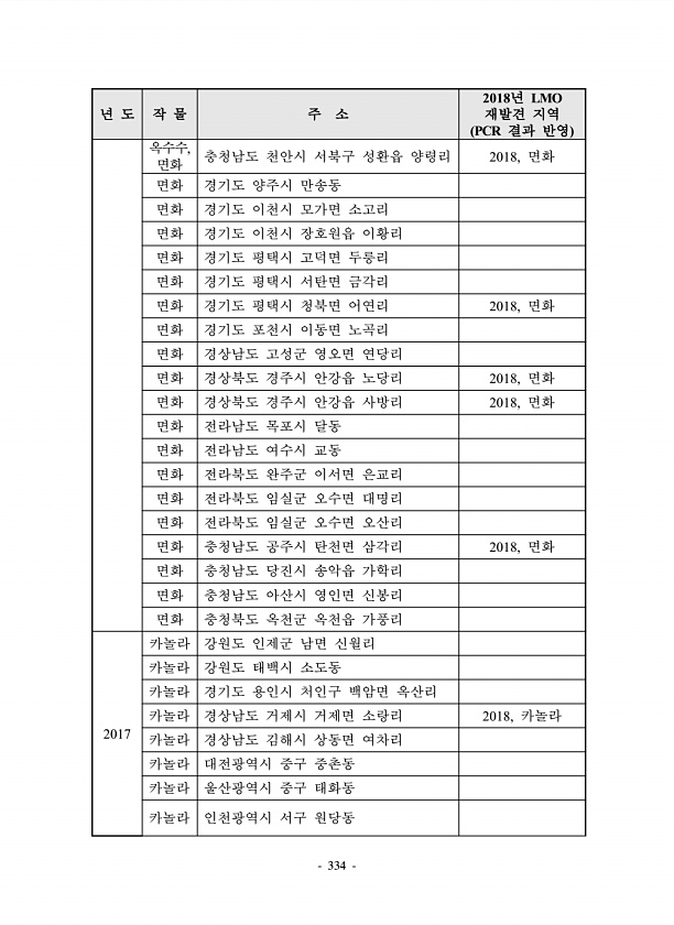 334 년 도 작 물 주 소 2018년 LMO 재발견 지역 PCR 결과 반영 옥수수, 면화 충청남도 천안시 서북구 성환읍 양령리 2018, 면화 면화 경기도 양주시 만송동 면화 경기도 이천시 모가면 소고리 면화 경기도 이천시 장호원읍 이황리 면화 경기도 평택시 고덕면 두릉리 면화 경기도 평택시 서탄면 금각리 면화 경기도 평택시 청북면 어연리 2018, 면화 면화 경기도 포천시 이동면 노곡리 면화 경상남도 고성군 영오면 연당리 면화 경상북도 경주시 안강읍 노당리 2018, 면화 면화 경상북도 경주시 안강읍 사방리 2018, 면화 면화 전라남도 목포시 달동 면화 전라남도 여수시 교동 면화 전라북도 완주군 이서면 은교리 면화 전라북도 임실군 오수면 대명리 면화 전라북도 임실군 오수면 오산리 면화 충청남도 공주시 ...