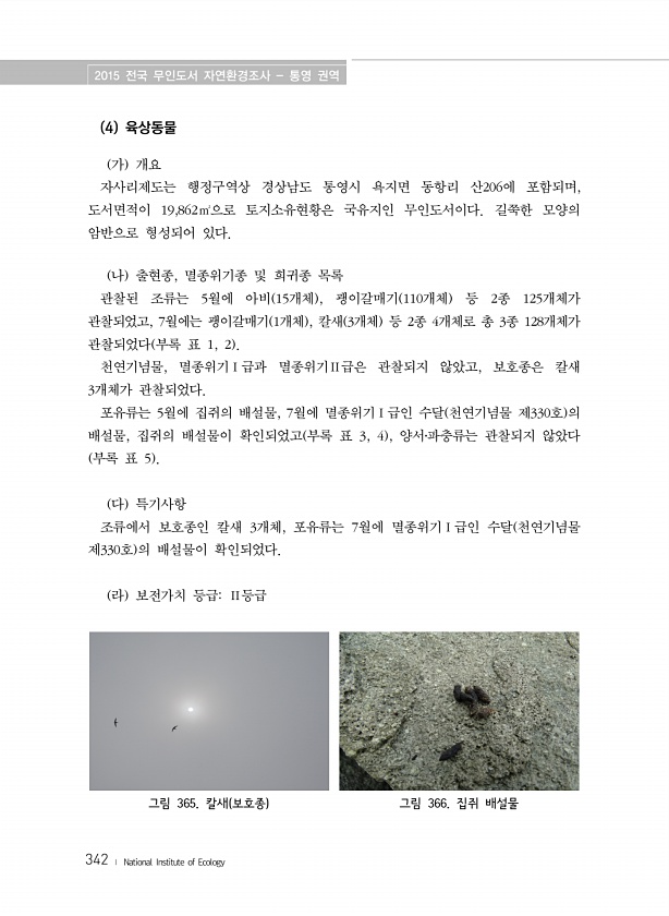 2015 전국 무인도서 자연환경조사 통영 권역 342 ? National Institute of Ecology 4 육상동물 가 개요 자사리제도는 행정구역상 경상남도 통영시 욕지면 동항리 산206에 포함되며, 도서면적이 19,862㎡으로 토지소유현황은 국유지인 무인도서이다. 길쭉한 모양의 암반으로 형성되어 있다. 나 출현종, 멸종위기종 및 희귀종 목록 관찰된 조류는 5월에 아비 15개체 , 괭이갈매기 110개체 등 2종 125개체가 관찰되었고, 7월에는 괭이갈매기 1개체 , 칼새 3개체 등 2종 4개체로 총 3종 128개체가 관찰되었다 부록 표 1, 2 천연기념물, 멸종위기Ⅰ급과 멸종위기Ⅱ급은 관찰되지 않았고, 보호종은 칼새 3개체가 관찰되었다. 포유류는 5월에 집쥐의 배설물, 7월에 멸종위기Ⅰ급인 수달 천연...