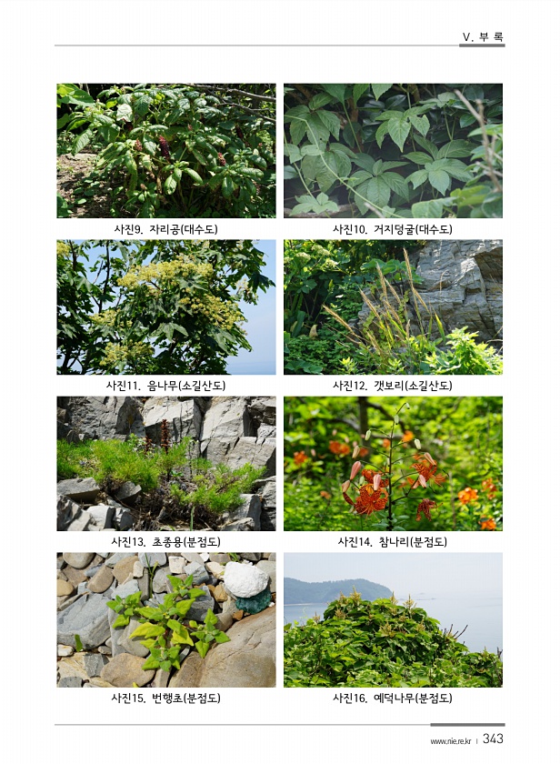 Ⅴ. 부 록 www.nie.re.kr ? 343 사진9. 자리공 대수도 사진10. 거지덩굴 대수도 사진11. 음나무 소길산도 사진12. 갯보리 소길산도 사진13. 초종용 분점도 사진14. 참나리 분점도 사진15. 번행초 분점도 사진16. 예덕나무 분점도