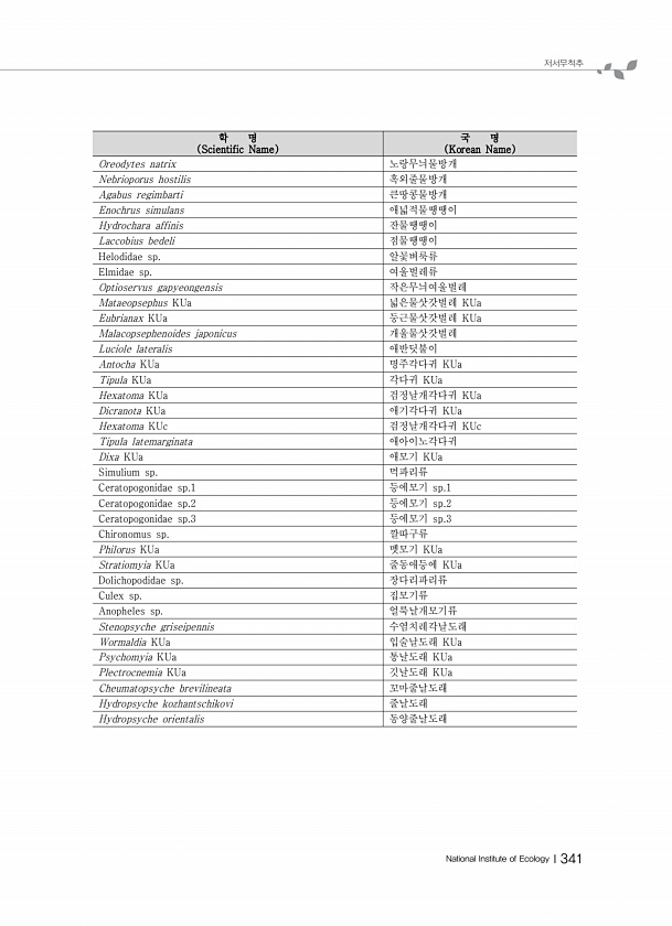 저서무척추 National Institute of EcologyⅠ341 학 명 Scientific Name 국 명 Korean Name Oreodytes natrix 노랑무늬물방개 Nebrioporus hostilis 혹외줄물방개 Agabus regimbarti 큰땅콩물방개 Enochrus simulans 애넓적물땡땡이 Hydrochara affinis 잔물땡땡이 Laccobius bedeli 점물땡땡이 Helodidae sp. 알꽃벼룩류 Elmidae sp. 여울벌레류 Optioservus gapyeongensis 작은무늬여울벌레 Mataeopsephus KUa 넓은물삿갓벌레 KUa Eubrianax KUa 둥근물삿갓벌레 KUa Malacopsephenoides japonicus 개울물삿갓벌레 Luciol...