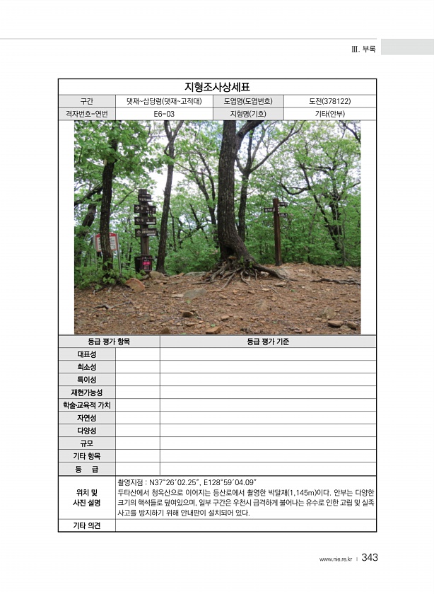 Ⅲ. 부록 www.nie.re.kr ? 343 지형조사상세표 구간 댓재삽당령 댓재고적대 도엽명 도엽번호 도전 378122 격자번호-연번 E6-03 지형명 기호 기타 안부 등급 평가 항목 등급 평가 기준 대표성 희소성 특이성 재현가능성 학술?교육적 가치 자연성 다양성 규모 기타 항목 등 급 위치 및 사진 설명 촬영지점 N37°26′02.25″, E128°59′04.09″ 두타산에서 청옥산으로 이어지는 등산로에서 촬영한 박달재 1,145m 이다. 안부는 다양한 크기의 핵석들로 덮여있으며, 일부 구간은 우천시 급격하게 불어나는 유수로 인한 고립 및 실족 사고를 방지하기 위해 안내판이 설치되어 있다. 기타의견