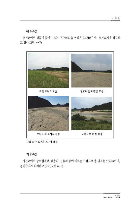 iv. 조 류 www.nie.re.kr ? 343 6 오천교에서 선몽대 등에 이르는 구간으로 총 면적은 2.43㎢이며, 오천습지가 위치하 고 있다 그림 ⅳ-7 하천 초지의 모습 형호리 앞 자갈밭 모습 오천교 위 조사지 전경 오천교 위 하천 전경 그림 ⅳ-7. 6구간 조사지 전경 7 경진교에서 상수월제방, 동송리, 신음리 등에 이르는 구간으로 총 면적은 5.57㎢이며, 경진습지가 위치하고 있다 그림 ⅳ-8