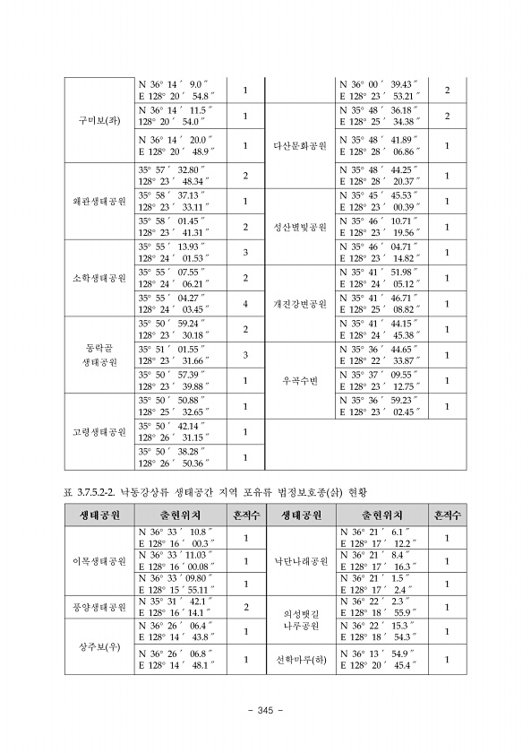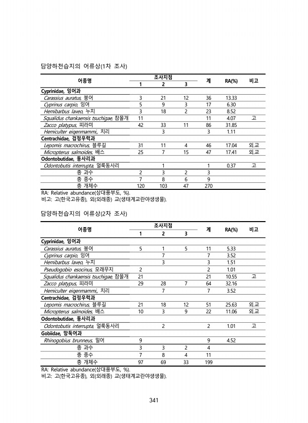 341 어종명 조사지점 계 RA % 비고 1 2 3 Cyprinidae, 잉어과 Carassius auratus, 붕어 3 21 12 36 13.33 Cyprinus carpio, 잉어 5 9 3 17 6.30 Hemibarbus laveo, 누치 3 18 2 23 8.52 Squalidus chankaensis tsuchigae, 참몰개 11 11 4.07 고 Zacco platypus, 피라미 42 33 11 86 31.85 Hemiculter eiqenmammi,, 치리 3 3 1.11 Centrachidae, 검정우럭과 Lepomis macrochirus, 블루길 31 11 4 46 17.04 외.교 Micropterus salmoides, 배스 25 7 15 47 17.41 외.교 Odontobut...