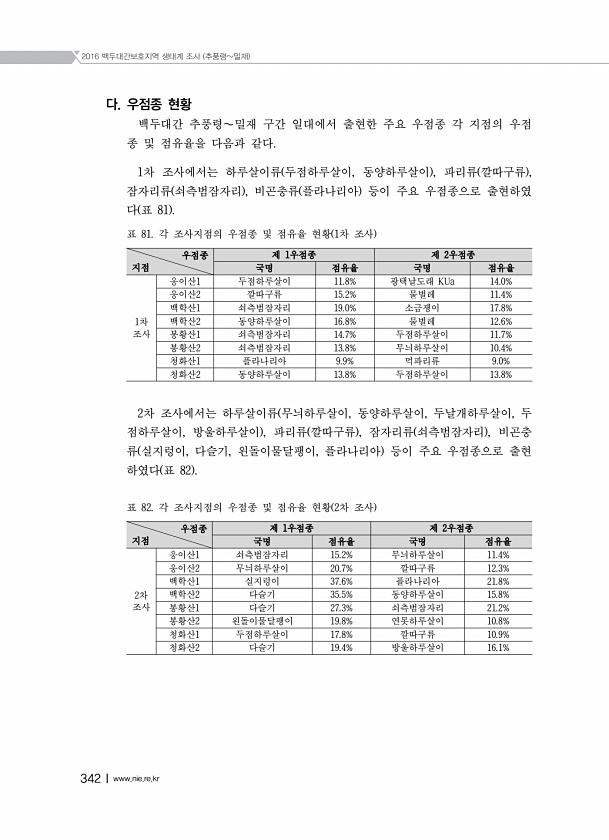 2016 백두대간보호지역 생태계 조사 추풍령밀재 342Ⅰwww.nie.re.kr 다. 우점종 현황 백두대간 추풍령∼밀재 구간 일대에서 출현한 주요 우점종 각 지점의 우점 종 및 점유율을 다음과 같다. 1차 조사에서는 하루살이류 두점하루살이, 동양하루살이 , 파리류 깔따구류 , 잠자리류 쇠측범잠자리 , 비곤충류 플라나리아 등이 주요 우점종으로 출현하였 다 표 81 우점종 지점 제 1우점종 제 2우점종 국명 점유율 국명 점유율 1차 조사 웅이산1 두점하루살이 11.8% 광택날도래 KUa 14.0% 웅이산2 깔따구류 15.2% 물벌레 11.4% 백학산1 쇠측범잠자리 19.0% 소금쟁이 17.8% 백학산2 동양하루살이 16.8% 물벌레 12.6% 봉황산1 쇠측범잠자리 14.7% 두점하루살이 11.7% 봉황산2 쇠측...