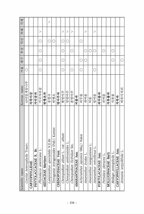 Scientific name Korean name 서울 대구 부산 익산 외래 식재 Corylus heterophylla Trautv. 난티잎개암나무 ○ CARYOPHYLLIDAE 석죽아강 PHYTOLACCACEAE R. Br. 자리공과 Phytolacca americana L. 미국자리공 ○ ○ ○ ○ ∨ AIZOACEAE Martinov 번행초과 Lampranthus spectabilis N.E.Br. 송엽국 ○ ∨ Tetragonia tetragonoides Pall. Kuntze 번행초 ○ CHENOPODIACEAE Vent. 명아주과 Chenopodium album L. var. album 흰명아주 ○ ○ ○ ○ ∨ Chenopodium ambrosioides L. 양...