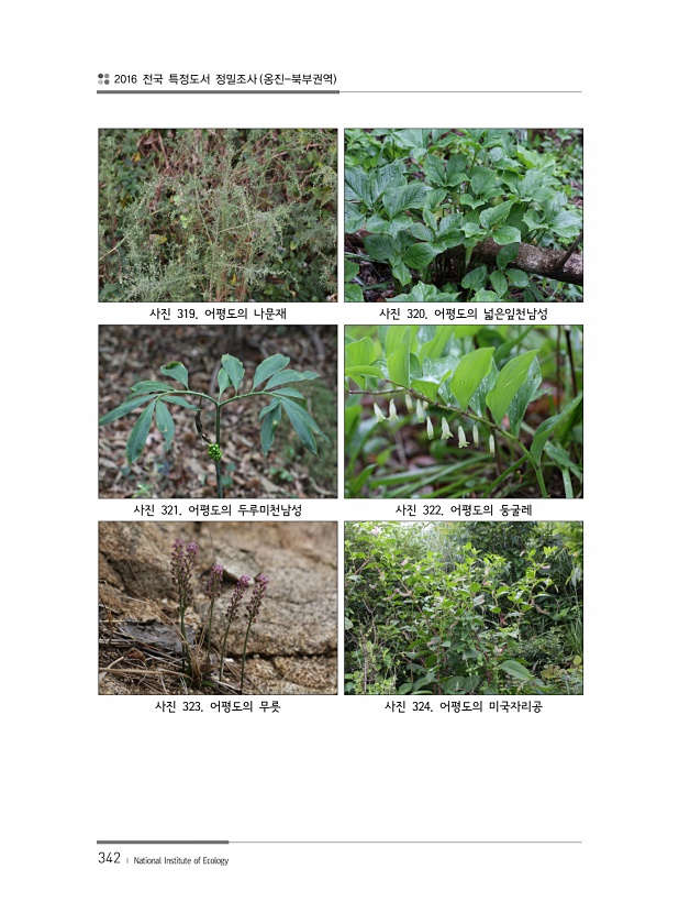 2016 전국 특정도서 정밀조사 옹진-북부권역 342 ? National Institute of Ecology 사진 319. 어평도의 나문재 사진 320. 어평도의 넓은잎천남성 사진 321. 어평도의 두루미천남성 사진 322. 어평도의 둥굴레 사진 323. 어평도의 무릇 사진 324. 어평도의미국자리공