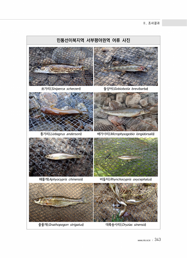Ⅱ. 조사결과 www.nie.re.kr ? 343 민통선이북지역 서부평야권역 어류 사진 쏘가리 Siniperca scherzeri 돌상어 Gobiobotia brevibarba 퉁가리 Liobagrus andersoni 배가사리 Microphysogobio longidorsalis 왜몰개 Aphyocypris chinensis 버들치 Rhynchocypris oxycephalus 줄몰개 Gnathopogon strigatus 대륙송사리 Oryzias sinensis