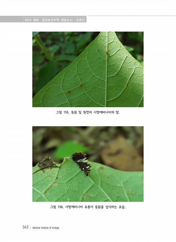 2015 생태·경관보전지역 정밀조사 운문산 342 ? National Institute of Ecology 그림 155. 등칡 잎 뒷면의 사향제비나비의 알. 그림 156. 사향제비나비 유충이 등칡을 섭식하는모습.