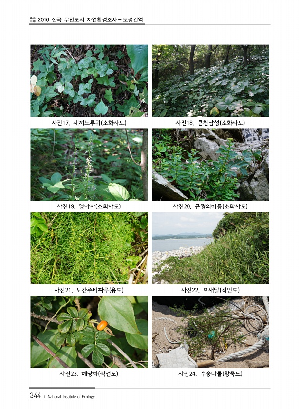 2016 전국 무인도서 자연환경조사 보령권역 344 ? National Institute of Ecology 사진17. 새끼노루귀 소화사도 사진18. 큰천남성 소화사도 사진19. 영아자 소화사도 사진20. 큰꿩의비름 소화사도 사진21. 노간주비짜루 용도 사진22. 모새달 직언도 사진23. 해당화 직언도 사진24. 수송나물 황죽도