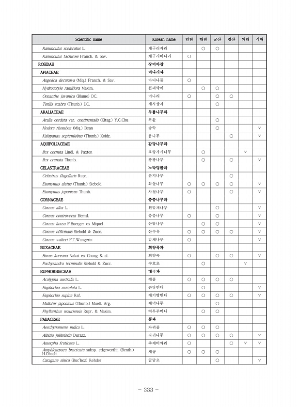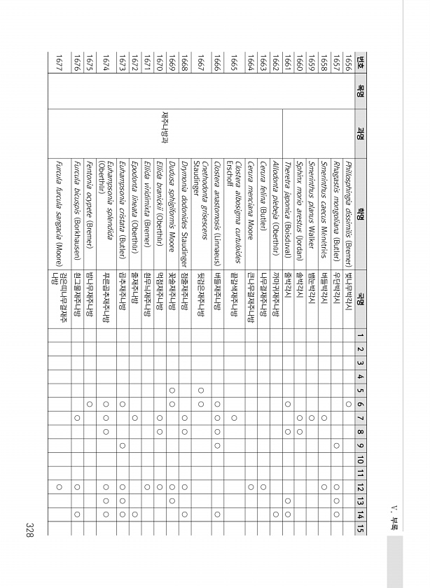 Ⅴ. 부록 328 번호 목명 과명 학명 국명 1 2 3 4 5 6 7 8 9 10 11 12 13 14 15 1656 Phillosphingia dissimilis Bremer 벚나무박각시 ○ 1657 Rhagastis mongoliana Butler 우단박각시 ○ ○ ○ ○ 1658 Smerinthus caecus M?n?tri?s 버들박각시 ○ ○ 1659 Smerinthus planus Walker 뱀눈박각시 ○ 1660 Sphinx morio arestus Jordan 솔박각시 ○ ○ 1661 Theretra japonica Boisduval 줄박각시 ○ ○ ○ ○ 1662 재주나방과 Allodonta plebeja Oberth?r 까마귀재주나방 ○ 1663 Cerura felina Butler 나무...