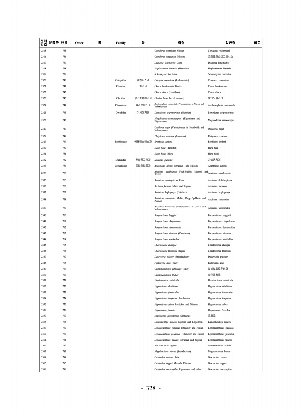 328 전체 번호 분류군 번호 Order 목 Family 과 학명 일반명 비고 2315 735 Corydoras weitzmani Nijssen Corydoras weitzmani 2316 736 Corydoras xinguensis Nijssen 코리도라스싱그엔시스 2317 737 Dianema longibarbis Cope Dianema longibarbis 2318 738 Hoplosternum littorale Hancock Hoplosternum littorale 2319 739 Scleromystax barbatus Scleromystax barbatus 2320 740 Cetopsidae 세톱시스과 Cetopsis coecutiens Lichtenstein Cetopsis coecutiens 2...