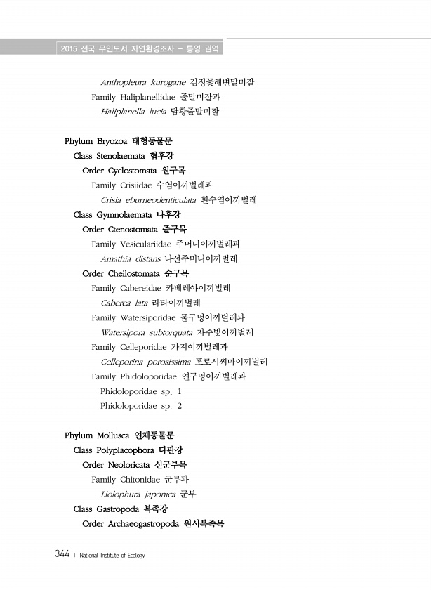 2015 전국 무인도서 자연환경조사 통영 권역 344 ? National Institute of Ecology Anthopleura kurogane 검정꽃해변말미잘 Family Haliplanellidae 줄말미잘과 Haliplanella lucia 담황줄말미잘 Phylum Bryozoa 태형동물문 Class Stenolaemata 협후강 Order Cyclostomata 원구목 Family Crisiidae 수염이끼벌레과 Crisia eburneodenticulata 흰수염이끼벌레 Class Gymnolaemata 나후강 Order Ctenostomata 즐구목 Family Vesiculariidae 주머니이끼벌레과 Amathia distans 나선주머니이끼벌레 Order Cheilostomata 순구목 ...