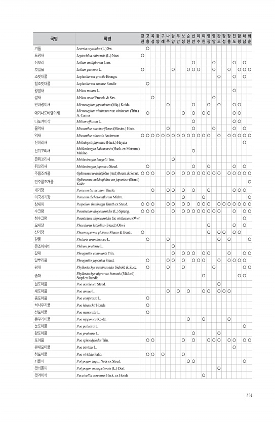 351 겨풀 Leersia oryzoides L. Sw. ○ 드렁새 Leptochloa chinensis L. Nees ○ 쥐보리 Lolium multiforum Lam. ○ ○ ○ ○ 호밀풀 Lolium perenne L. ○ ○ ○ ○ ○ ○ ○ ○ ○ ○ 조릿대풀 Lophatherum gracile Brongn. ○ ○ ○ 털조릿대풀 Lophatherum sinense Rendle ○ 왕쌀새 Melica nutans L. ○ 쌀새 Melica onoei Franch. & Sav. ○ ○ 민바랭이새 Microstegium japonicum Miq. Koidz. ○ ○ ○ ○ ○ ○ 애기나도바랭이새 Microstegium vimineum var. vimineum Trin. A. Camus ○ ○ ○ ○ ○...