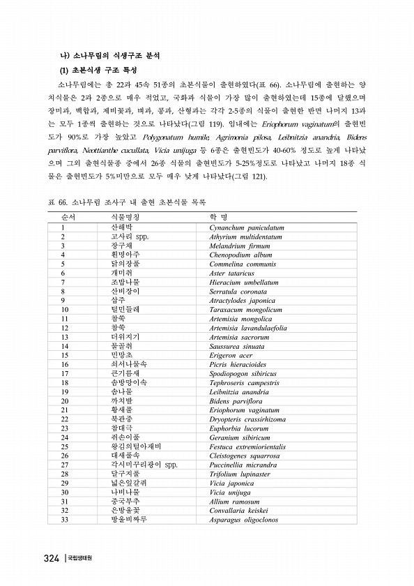 순서 식물명칭 학 명 1 산해박 Cynanchum paniculatum 2 고사리 spp. Athyrium multidentatum 3 장구채 Melandrium firmum 4 흰명아주 Chenopodium album 5 닭의장풀 Commelina communis 6 개미취 Aster tataricus 7 조밥나물 Hieracium umbellatum 8 산비장이 Serratula coronata 9 삽주 Atractylodes japonica 10 털민들레 Taraxacum mongolicum 11 참쑥 Artemisia mongolica 12 참쑥 Artemisia lavandulaefolia 13 더위지기 Artemisia sacrorum 14 물골취 Saussurea sinuata 15 민망초 Er...