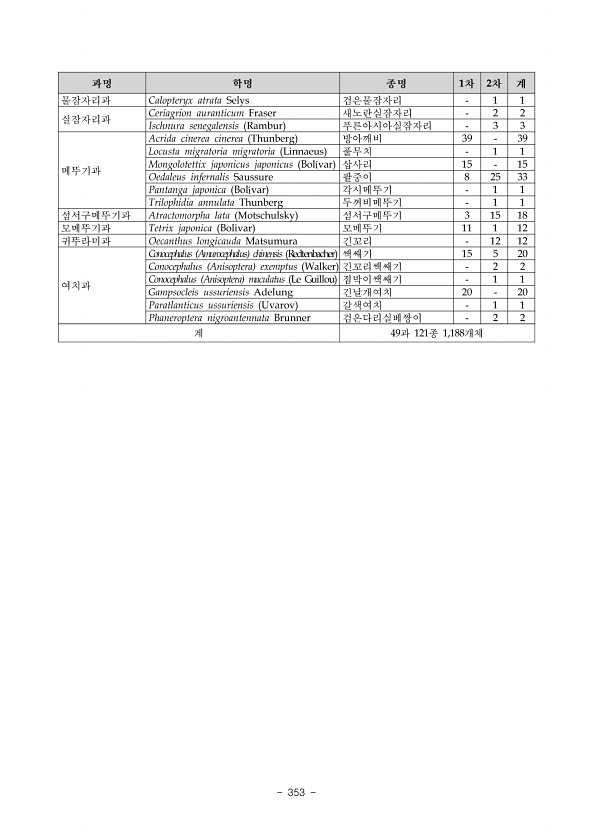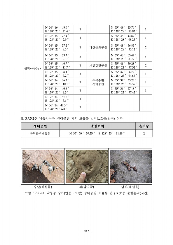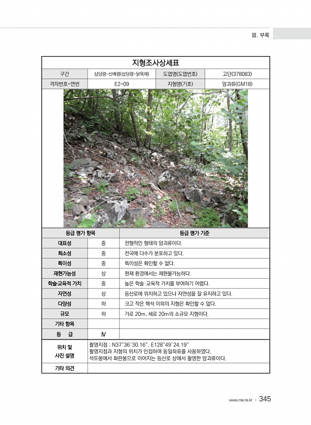 Ⅲ. 부록 www.nie.re.kr ? 345 지형조사상세표 구간 삽당령신배령 삽당령닭목재 도엽명 도엽번호 고단 378083 격자번호-연번 E2-09 지형명 기호 암괴류 GM18 등급 평가 항목 등급 평가 기준 대표성 중 전형적인 형태의 암괴류이다. 희소성 중 전국에 다수가 분포하고 있다. 특이성 중 특이성은 확인할 수 없다. 재현가능성 상 현재 환경에서는 재현불가능하다. 학술?교육적 가치 중 높은 학술·교육적 가치를 부여하기 어렵다. 자연성 상 등산로에 위치하고 있으나 자연성을 잘 유지하고 있다. 다양성 하 크고 작은 핵석 이외의 지형은 확인할 수 없다. 규모 하 가로 20m, 세로 20m의 소규모 지형이다. 기타 항목 등 급 Ⅳ 위치 및 사진 설명 촬영지점 N37°36′30.16″, E128°49′24....