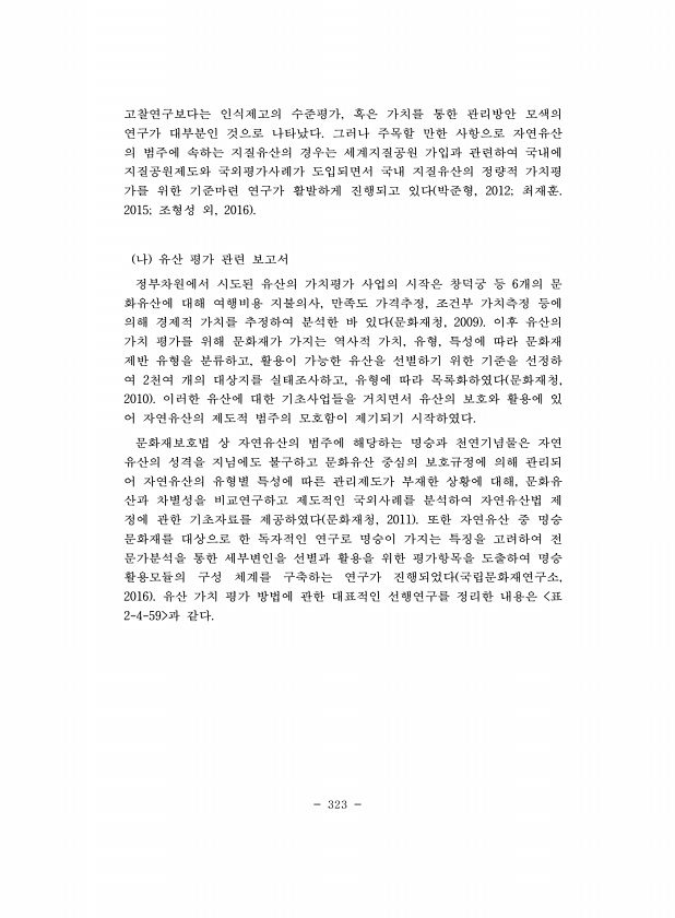 323 고찰연구보다는 인식제고의 수준평가, 혹은 가치를 통한 관리방안 모색의 연구가 대부분인 것으로 나타났다. 그러나 주목할 만한 사항으로 자연유산 의 범주에 속하는 지질유산의 경우는 세계지질공원 가입과 관련하여 국내에 지질공원제도와 국외평가사례가 도입되면서 국내 지질유산의 정량적 가치평 가를 위한 기준마련 연구가 활발하게 진행되고 있다 박준형, 2012; 최재훈. 2015; 조형성 외, 2016 나 유산 평가 관련 보고서 정부차원에서 시도된 유산의 가치평가 사업의 시작은 창덕궁 등 6개의 문 화유산에 대해 여행비용 지불의사, 만족도 가격추정, 조건부 가치측정 등에 의해 경제적 가치를 추정하여 분석한 바 있다 문화재청, 2009 이후 유산의 가치 평가를 위해 문화재가 가지는 역사적 가치, 유형, 특성에 따라...