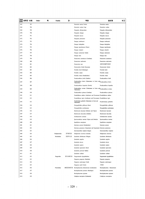 329 전체 번호 분류군 번호 Order 목 Family 과 학명 일반명 비고 2367 787 Otocinclus mariae Fowler Otocinclus mariae 2368 788 Otocinclus vestitus Cope Otocinclus vestitus 2369 789 Panaqolus albomaculatus Panaqolus albomaculatus 2370 790 Panaqolus changae Panaqolus changae 2371 791 Panaqolus maccus Panaqolus maccus 2372 792 Panaqolus purusiensis Panaqolus purusiensis 2373 793 Panaque armbrusteri Panaque armbrusteri 237...