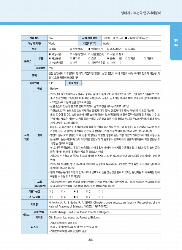 351 생태계 기후변화 연구사례분석 통 합 사례 No. 276 사례 자료 유형 □논문 □ 보고서 ■ 기타 학술/기사자료 대상지 국가 World 대상지 지역 World 부문 □ 통합 □ 취약성평가 ■ 영향성평가 □ 리스크평가 □ 모델링 분류군 부문 ■ 육상식물 □ 식물 침엽수 □ 식물 활엽수 □ 식물 초 본 ■ 육상동물 □ 포유류 □ 조류 ■ 곤충 류 □ 양서류 □ 파충류 □ 수상동식물 □ 어류 □ 저서무척추류 □ 기타 세부정보 산림 목적 산림 산업에서 기후변화의 잠재적, 직접적인 영향과 상업 임업의 미래 트렌드 예측, 바이오 연료의 가능한 역 할, 수요와 공급의 변화를 파악 기후인자 T, P 자료기간 사례 개요 방법 Review 결과 2005년에 임목축적의 434십억㎥ 중에서 숲의 3.5십억㎥이 제거되었는데...