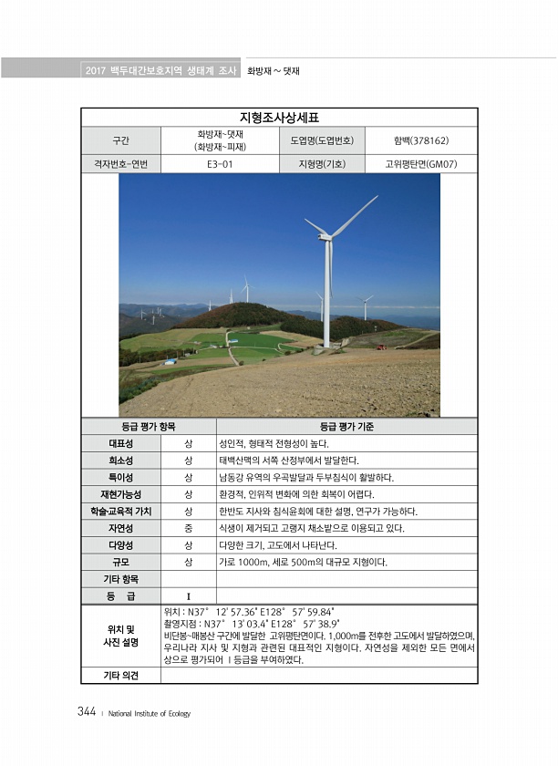 2017 백두대간보호지역 생태계 조사 화방재 댓재 344 ? National Institute of Ecology 지형조사상세표 구간 화방재댓재 화방재피재 도엽명 도엽번호 함백 378162 격자번호-연번 E3-01 지형명 기호 고위평탄면 GM07 등급 평가 항목 등급 평가 기준 대표성 상 성인적, 형태적 전형성이 높다. 희소성 상 태백산맥의 서쪽 산정부에서 발달한다. 특이성 상 남동강 유역의 우곡발달과 두부침식이 활발하다. 재현가능성 상 환경적, 인위적 변화에 의한 회복이 어렵다. 학술?교육적 가치 상 한반도 지사와 침식윤회에 대한 설명, 연구가 가능하다. 자연성 중 식생이 제거되고 고랭지 채소밭으로 이용되고 있다. 다양성 상 다양한 크기, 고도에서 나타난다. 규모 상 가로 1000m, 세로 500m의 대규...