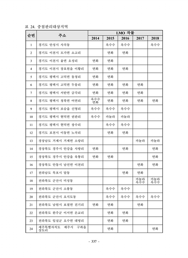 337 순번 주소 LMO 작물 2014 2015 2016 2017 2018 1 경기도 안성시 사곡동 옥수수 옥수수 옥수수 2 경기도 이천시 모가면 소고리 면화 면화 3 경기도 이천시 율면 오성리 면화 면화 4 경기도 이천시 장호원읍 이황리 면화 면화 면화 5 경기도 평택시 고덕면 동청리 면화 면화 6 경기도 평택시 고덕면 두릉리 면화 면화 면화 면화 7 경기도 평택시 서탄면 금각리 면화 면화 면화 면화 8 경기도 평택시 청북면 어연리 옥수수 면화 면화 면화 면화 면화 9 경기도 평택시 포승읍 신영리 옥수수 옥수수 옥수수 10 경기도 평택시 현덕면 권관리 옥수수 카놀라 카놀라 11 경기도 평택시 현덕면 장수리 옥수수 옥수수 12 경기도 포천시 이동면 노곡리 면화 면화 13 경상남도 거제시 거제면 소랑리 카놀라...