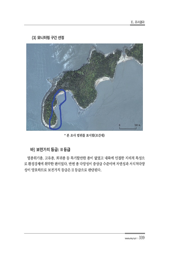 II. 조사결과 www.nie.re.kr ?339 3 * 본 조사 범위를 표시함 조간대 멸종위기종, 고유종, 희귀종 등 특기할만한 종이 없었고 내륙에 인접한 지리적 특성으 로 환경강제에 취약한 편이었다. 반면 종 다양성이 중상급 수준이며 자연성과 서식처다양 성이 양호하므로 보전가치 등급은 II 등급으로판단된다.