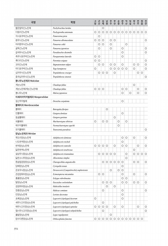 354 짧은알락긴노린재 Pachybrachius luridus ○ 더듬이긴노린재 Pachygrontha antennata ○ ○ ○ ○ ○ ○ ○ ○ ○ ○ ○ ○ ○ ○ 각시표주박긴노린재 Pamerarma picta ○ 흰무늬긴노린재 Panaorus albomaculatus ○ ○ ○ ○ ○ ○ 어리흰무늬긴노린재 Panaorus csikii ○ ○ ○ ○ 굴뚝긴노린재 Panaorus japonicus ○ ○ ○ ○ 갈색무늬긴노린재 Paradieuches dissimilis ○ ○ 측무늬표주박긴노린재 Paraparomius lateralis ○ ○ ○ 흑다리긴노린재 Paromius exiguus ○ ○ ○ 꼬마긴노린재 Stigmatonotum rufpes ○ ○ ○ ○ ○ ○ ○ ○ 미디표주박긴노린재 Tog...