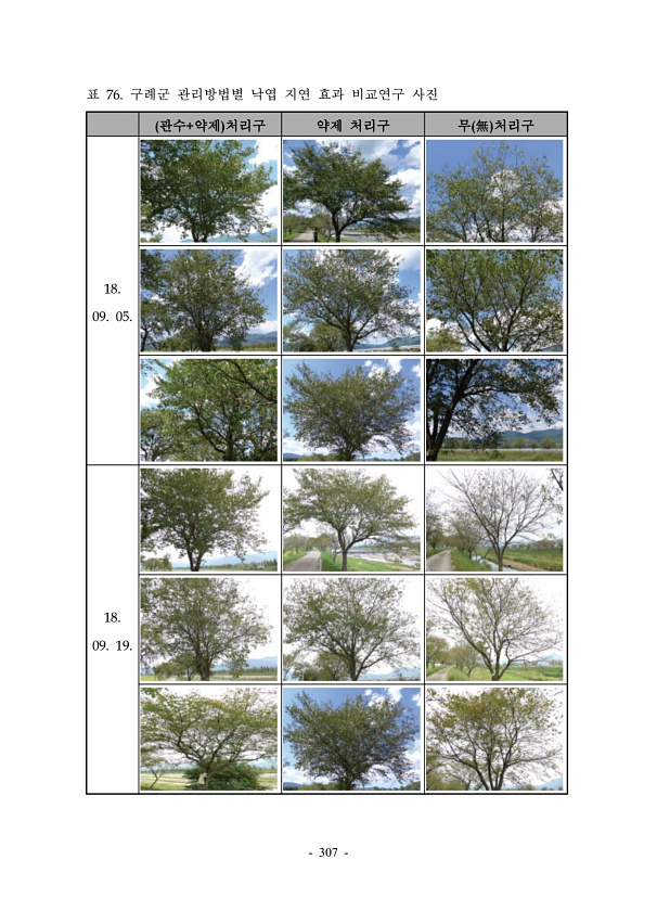 307 관수+약제 처리구 약제 처리구 무 無 처리구 18. 09. 05. 18. 09. 19. 표 76. 구례군 관리방법별 낙엽 지연 효과 비교연구사진