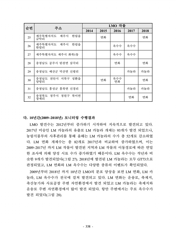 338 순번 주소 LMO 작물 2014 2015 2016 2017 2018 25 제주특별자치도 제주시 한림읍 금악리 면화 면화 26 제주특별자치도 제주시 한림읍 한림리 옥수수 옥수수 27 제주특별자치도 제주시 화북1동 옥수수 옥수수 28 충청남도 공주시 탄천면 삼각리 면화 면화 29 충청남도 예산군 덕산면 신평리 카놀라 카놀라 30 충청남도 천안시 서북구 성환읍 양령리 면화 옥수수 면화 면화 31 충청남도 홍성군 홍북면 신경리 카놀라 카놀라 32 충청북도 청주시 청원구 북이면 장재리 면화 면화 다. 10년간 20092018년 모니터링 수행결과 LMO 발견수는 2012년부터 증가하기 시작하여 지속적으로 발견되고 있다. 2017년 미승인 LM 카놀라의 유출로 LM 카놀라 개체는 93개가 발견 되었으나, 농림식품...