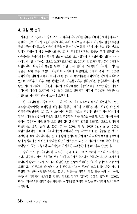 2018 DMZ 일원 생태계 조사 민통선이북지역 중부산악권역 346 ? National Institute of Ecology 4. 고찰 및 논의 성재산 코스 2-3부터 도창리 코스 1-1까지의 김화남대천 일대는 대대적인 하천정비공사가 진행되고 있어 서식지 교란이 심각하였다. 특히 이 지역은 과거부터 지금까지 법정보호종인 묵납자루와 가는돌고기, 다묵장어 등을 비롯하여 30여종의 어류가 서식하고 있는 것으로 알려져 다양성이 매우 높았다 고 등, 2013; 국립환경과학원, 2013 특히 멸종위기종 다묵장어는 한강수계에서 급격히 감소한 것으로 보고되었는데, 임진강에서는 김화남대천과 사미천에서만 서식하는 것으로 보고되었으며 고 등, 2013 본 조사에서는 유생 1개체가 채집되었다. 다묵장어 유생은 유속이 느린 소의 ...