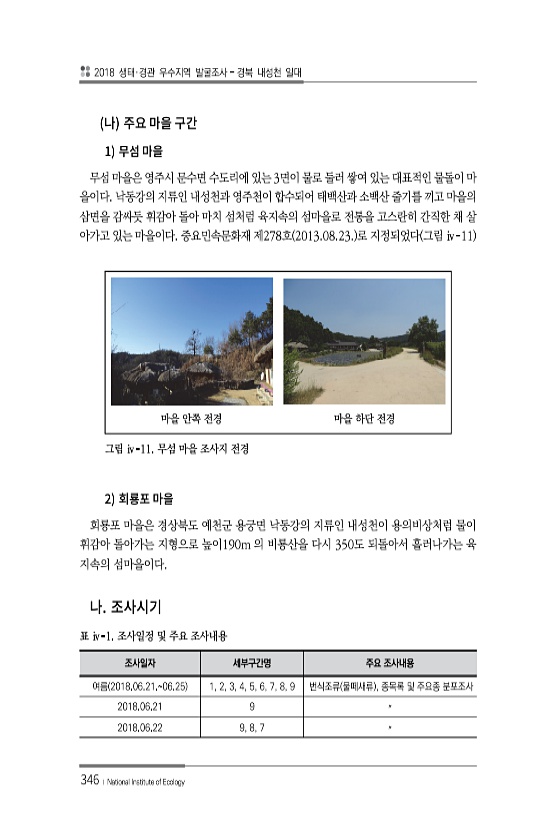 2018 생태·경관 우수지역 발굴조사 경북 내성천 일대 346 ? National Institute of Ecology 1 무섬 마을은 영주시 문수면 수도리에 있는 3면이 물로 둘러 쌓여 있는 대표적인 물돌이 마 을이다. 낙동강의 지류인 내성천과 영주천이 합수되어 태백산과 소백산 줄기를 끼고 마을의 삼면을 감싸듯 휘감아 돌아 마치 섬처럼 육지속의 섬마을로 전통을 고스란히 간직한 채 살 아가고 있는 마을이다. 중요민속문화재 제278호 2013.08.23. 로 지정되었다 그림 ⅳ-11 마을 안쪽 전경 마을 하단 전경 그림 ⅳ-11. 무섬 마을 조사지 전경 2 회룡포 마을은 경상북도 예천군 용궁면 낙동강의 지류인 내성천이 용의비상처럼 물이 휘감아 돌아가는 지형으로 높이190m 의 비룡산을 다시 350도 되돌아서 ...