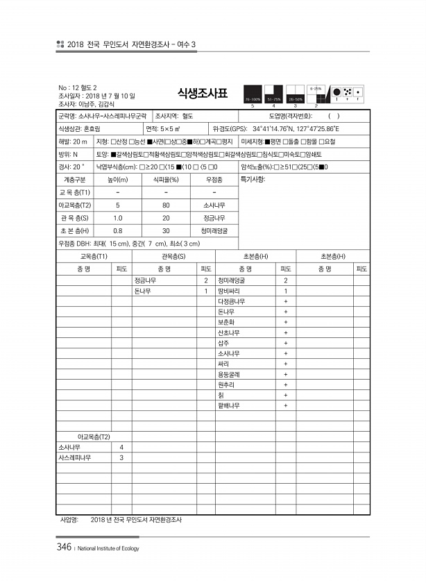 2018 전국 무인도서 자연환경조사 여수 3 346 ? National Institute of Ecology No 12 혈도 2 조사일자 2018 년 7 월 10 일 조사자이남주, 김갑식 식생조사표 군락명소사나무-사스레피나무군락 조사지역혈도 도엽명 격자번호 식생상관혼효림 면적5×5 ㎡ 위?경도 GPS 34°4114.76N, 127°4725.86E 해발20 m 지형□산정 □능선 ■사면 □상□중■하 □계곡□평지 미세지형■평면 □돌출 □함몰 □요철 방위N 토양■갈색삼림토□적황색삼림토□암적색삼림토□회갈색삼림토□침식토□미숙토□암쇄토 경사20 ° 낙엽부식층 cm □≥20 □ 15 ■ 10 □ 5 □0 암석노출 % □≥51□ 25□ 5■0 계층구분 높이 m 식피율 % 우점종 특기사항교 목 층 T1 아교목층 T2 5 80...