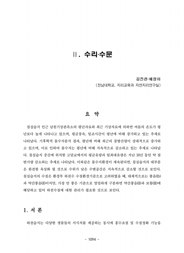 1094 Ⅱ. 수리?수문 김진관·배정아 전남대학교, 지리교육과 자연지리연구실 요 약 침실습지 인근 남원기상관측소의 평년자료와 최근 기상자료에 의하면 여름의 온도가 평 년보다 높게 나타나고 있으며, 평균풍속, 일조시간이 평년에 비해 증가하고 있는 추세로 나타났다. 기후학적 물수지분석 결과, 평년에 비해 최근의 증발산량이 상대적으로 증가하 고 있으며, 이로 인하여 물수지는 평년에 비해 지속적으로 감소하고 있는 추세로 나타났 다. 침실습지 중간에 위치한 고달교에서의 평균유량과 일최대유량은 지난 10년 동안 약 절 반가량 감소하는 추세로 나타났다. 이와같은 물수지환경이 계속된다면, 침실습지의 대부분 은 완전한 육상화 될 것으로 수위가 낮은 수변공간은 지속적으로 감소할 것으로 보인다. 침실습지의 수질은 환경부 하천수...