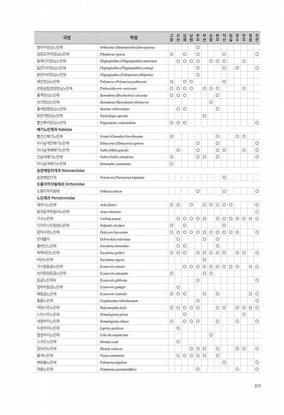 355 명아주장님노린재 Orthotylus Melanotrichus favosparsus ○ 검정표주박장님노린재 Pilophorus typicus ○ ○ ○ ○ ○ 발해다리장님노린재 Plagiognathus Plagiognathus amurensis ○ ○ ○ ○ ○ ○ ○ ○ 닮은다리장님노린재 Plagiognathus Plagiognathus yomogi ○ ○ ○ ○ 밝은다리장님노린재 Plagiognathus Poliopterus albipennis ○ 페킨장님노린재 Polymerus Polymerus pekinensis ○ ○ ○ ○ 큰흰솜털검정장님노린재 Proboscidocoris varicornis ○ ○ ○ ○ ○ ○ ○ ○ 홍맥장님노린재 Stenodema Brachystira calcarata ...