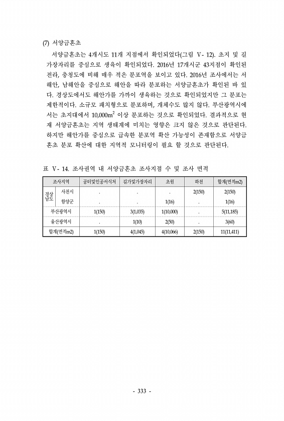 7 서양금혼초 서양금혼초는 4개시도 11개 지점에서 확인되었다 그림 Ⅴ- 12 초지 및 길 가장자리를 중심으로 생육이 확인되었다. 2016년 17개시군 43지점이 확인된 전라, 충청도에 비해 매우 적은 분포역을 보이고 있다. 2016년 조사에서는 서 해안, 남해안을 중심으로 해안을 따라 분포하는 서양금혼초가 확인된 바 있 다. 경상도에서도 해안가를 가까이 생육하는 것으로 확인되었지만 그 분포는 제한적이다. 소규모 패치형으로 분포하며, 개체수도 많지 않다. 부산광역시에 서는 초지대에서 10,000m2 이상 분포하는 것으로 확인되었다. 결과적으로 현 재 서양금혼초는 지역 생태계에 미치는 영향은 크지 않은 것으로 판단된다. 하지만 해안가를 중심으로 급속한 분포역 확산 가능성이 존재함으로 서양금 혼초 분포 확산에 ...