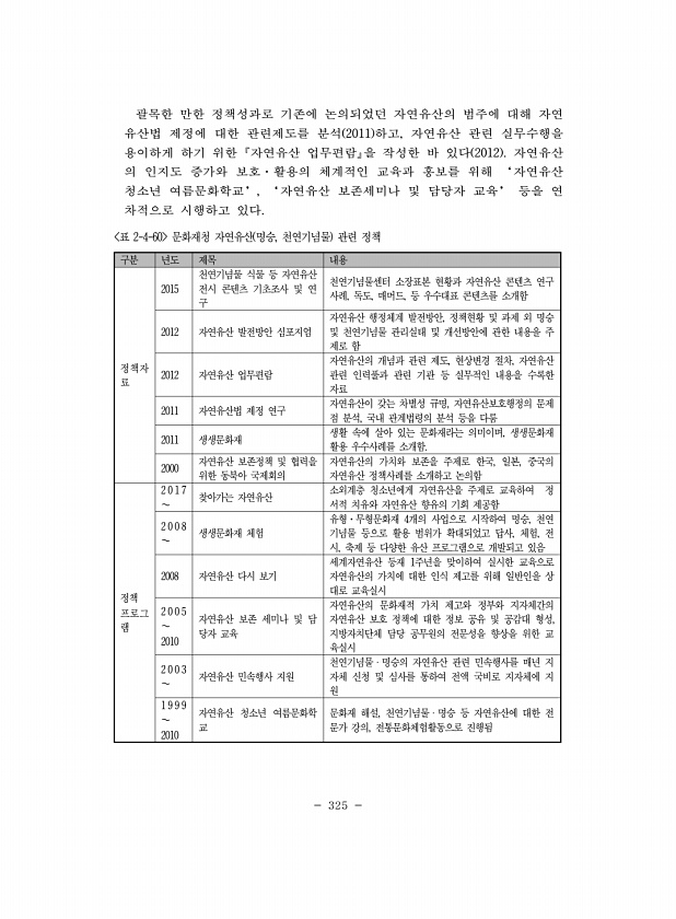 325 구분 년도 제목 내용 정책자 료 2015 천연기념물 식물 등 자연유산 전시 콘텐츠 기초조사 및 연 구 천연기념물센터 소장표본 현황과 자연유산 콘텐츠 연구 사례, 독도, 매머드, 등 우수대표 콘텐츠를 소개함 2012 자연유산 발전방안 심포지엄 자연유산 행정체계 발전방안, 정책현황 및 과제 외 명승 및 천연기념물 관리실태 및 개선방안에 관한 내용을 주 제로 함 2012 자연유산 업무편람 자연유산의 개념과 관련 제도, 현상변경 절차, 자연유산 관련 인력풀과 관련 기관 등 실무적인 내용을 수록한 자료 2011 자연유산법 제정 연구 자연유산이 갖는 차별성 규명, 자연유산보호행정의 문제 점 분석, 국내 관계법령의 분석 등을 다룸 2011 생생문화재 생활 속에 살아 있는 문화재라는 의미이며, 생생문화재 활용 우수...