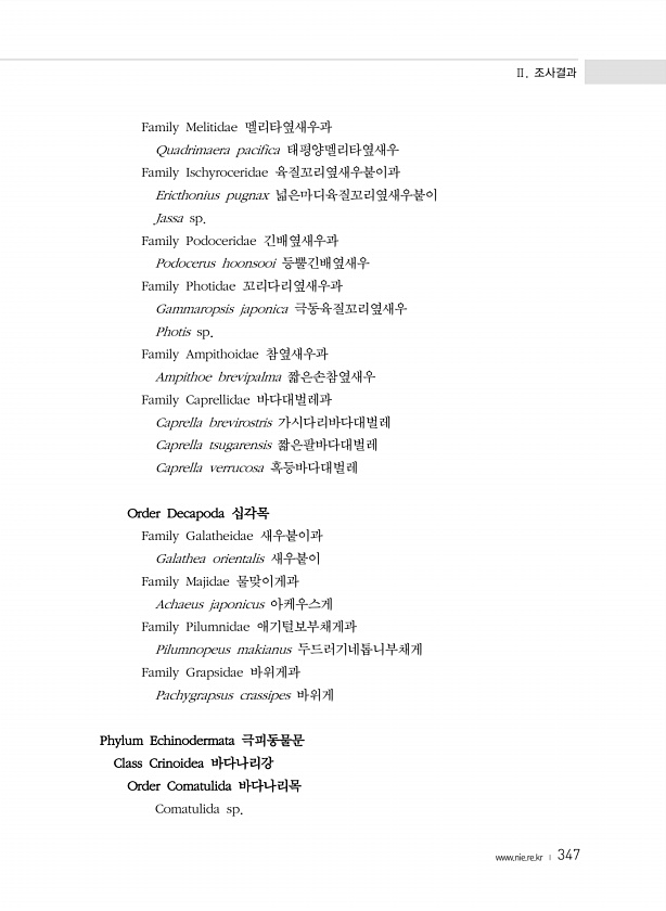 Ⅱ. 조사결과 www.nie.re.kr ? 347 Family Melitidae 멜리타옆새우과 Quadrimaera pacifica 태평양멜리타옆새우 Family Ischyroceridae 육질꼬리옆새우붙이과 Ericthonius pugnax 넓은마디육질꼬리옆새우붙이 Jassa sp. Family Podoceridae 긴배옆새우과 Podocerus hoonsooi 등뿔긴배옆새우 Family Photidae 꼬리다리옆새우과 Gammaropsis japonica 극동육질꼬리옆새우 Photis sp. Family Ampithoidae 참옆새우과 Ampithoe brevipalma 짧은손참옆새우 Family Caprellidae 바다대벌레과 Caprella brevirostris 가시다리바다대벌레 Caprella ...