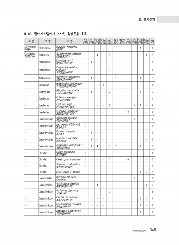 Ⅱ. 조사결과 www.nie.re.kr ? 345 목 명 과 명 학 명 7/1 2구간 8/3 2구간 9/18 2구간 10/27 2구간 7/1 3구간 8/3 3구간 10/27 3구간 7/1 4구간 8/3 4구간 9/18 4구간 10/27 4구간 합계 Dictyoptera 바퀴목 Blattellidae Blattella nipponica 산바퀴 1 1 Coleoptera 딱정벌레목 Anthicidae Anthicomorphus niponicus 검은좀뿔벌레 1 1 1 3 Anthribidae Enereytes gotoi 흰원무늬소바구미 1 1 Anthribidae Platysomos sell...
