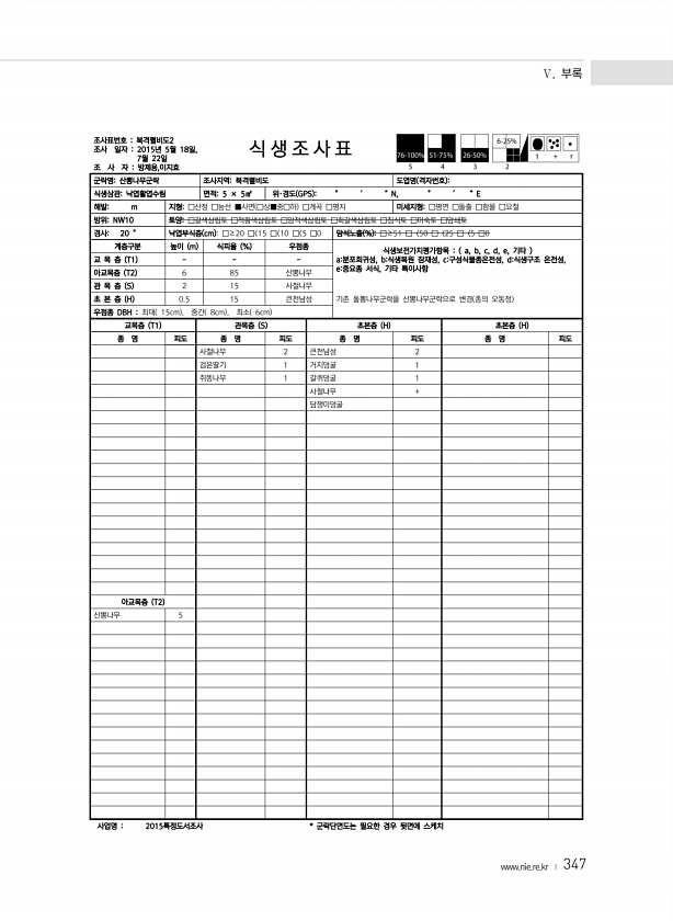 Ⅴ. 부록 www.nie.re.kr ? 347 조사표번호 북격렬비도2 조사 일자 2015년 5월 18일, 7월 22일 조 사 자 방제용,이지효 식 생 조 사 표 군락명산뽕나무군락 조사지역북격렬비도 도엽명 격자번호 식생상관낙엽활엽수림 면적5 × 5㎡ 위·경도 GPS ° ′ ″N, ° ′ ″E 해발m 지형□산정 □능선 ■사면 □상■중□하 □계곡 □평지 미세지형□평면 □돌출 □함몰 □요철 방위NW10 토양□갈색삼림토 □적황색삼림토 □암적색삼림토 □회갈색삼림토 □침식토 □미숙토 □암쇄토 경사20 ° 낙엽부식층 cm □≥20 □ 15 □ 10 □ 5 □0 암석노출 % □≥51 □〈50 □〈25 □〈5 □0 계층구분 높이 m 식피율 % 우점종 식생보전가치평가항목 a, b, c, d, e, 기타 a분포희귀성, b식생복원...