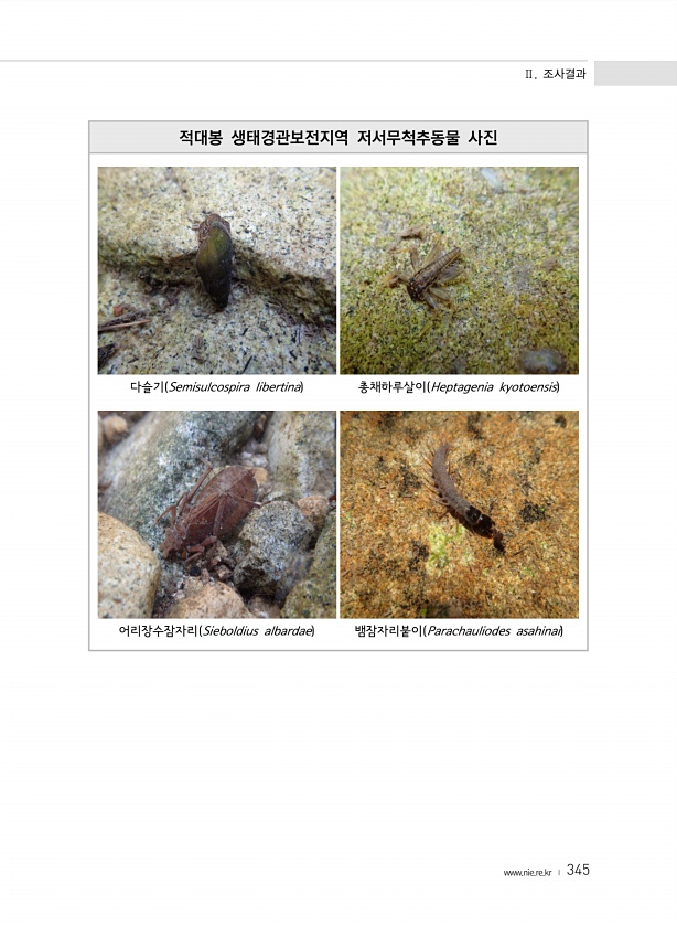 Ⅱ. 조사결과 www.nie.re.kr ? 345 적대봉 생태경관보전지역 저서무척추동물 사진 다슬기 Semisulcospira libertina 총채하루살이 Heptagenia kyotoensis 어리장수잠자리 Sieboldius albardae 뱀잠자리붙이 Parachauliodes asahinai