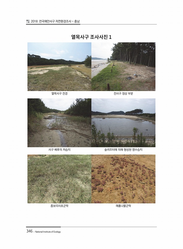 2018 전국해안사구 자연환경조사 충남 346 ? National Institute of Ecology 열목사구 전경 전사구 정상 부분 사구 배후의 저습지 슬러프터에 의해 형성된 염수습지 좀보리사초군락 해홍나물군락1