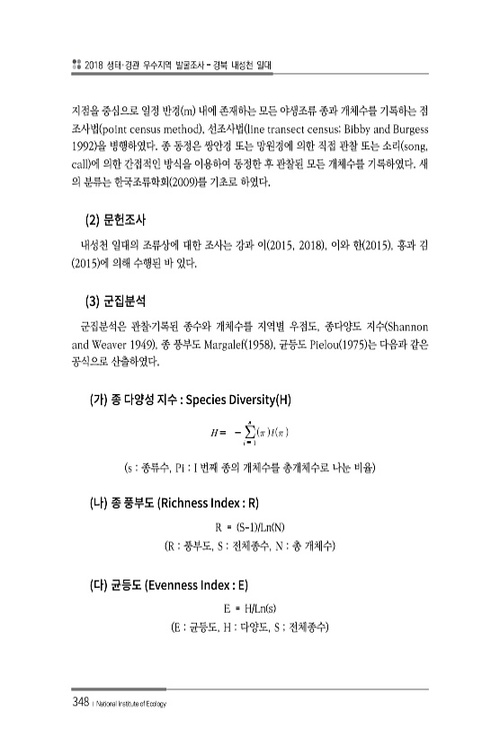 2018 생태·경관 우수지역 발굴조사 경북 내성천 일대 348 ? National Institute of Ecology 지점을 중심으로 일정 반경 m 내에 존재하는 모든 야생조류 종과 개체수를 기록하는 점 조사법 point census method , 선조사법 line transect census; Bibby and Burgess 1992 을 병행하였다. 종 동정은 쌍안경 또는 망원경에 의한 직접 관찰 또는 소리 song, call 에 의한 간접적인 방식을 이용하여 동정한 후 관찰된 모든 개체수를 기록하였다. 새 의 분류는 한국조류학회 2009 를 기초로 하였다. 2 내성천 일대의 조류상에 대한 조사는 강과 이 2015, 2018 , 이와 한 2015 , 홍과 김 2015 에 의해 수행된 바 있다. 3 군집...