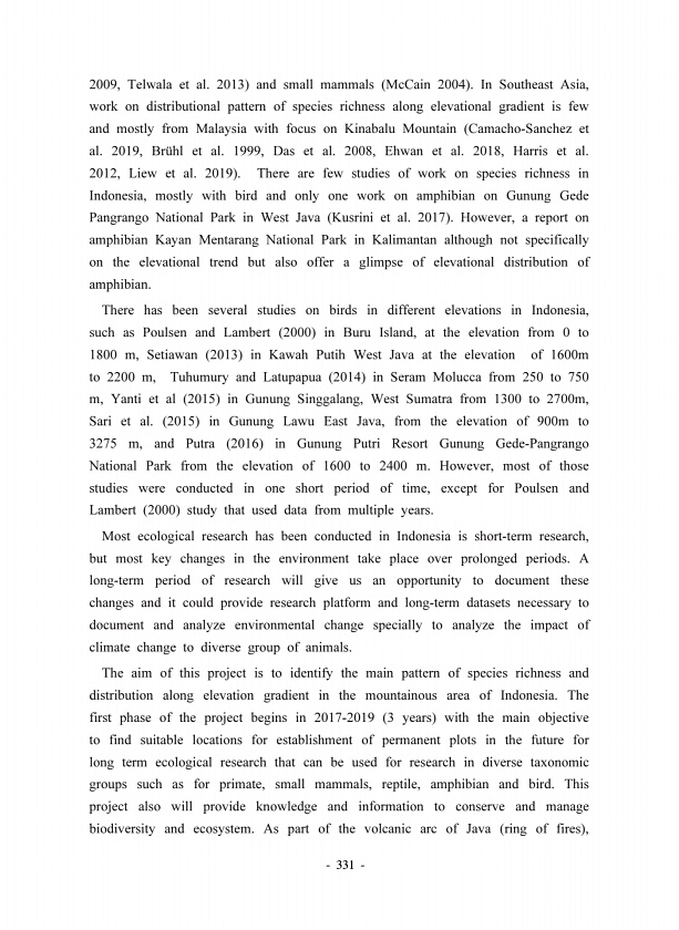 331 2009, Telwala et al. 2013 and small mammals McCain 2004 In Southeast Asia, work on distributional pattern of species richness along elevational gradient is few and mostly from Malaysia with focus on Kinabalu Mountain Camacho-Sanchez et al. 2019, Br?hl et al. 1999, Das et al. 2008, Ehwan et al. 2018, Harris et al. 2012, Liew et al. 2019 There are few studies of work on species richness in Indon...